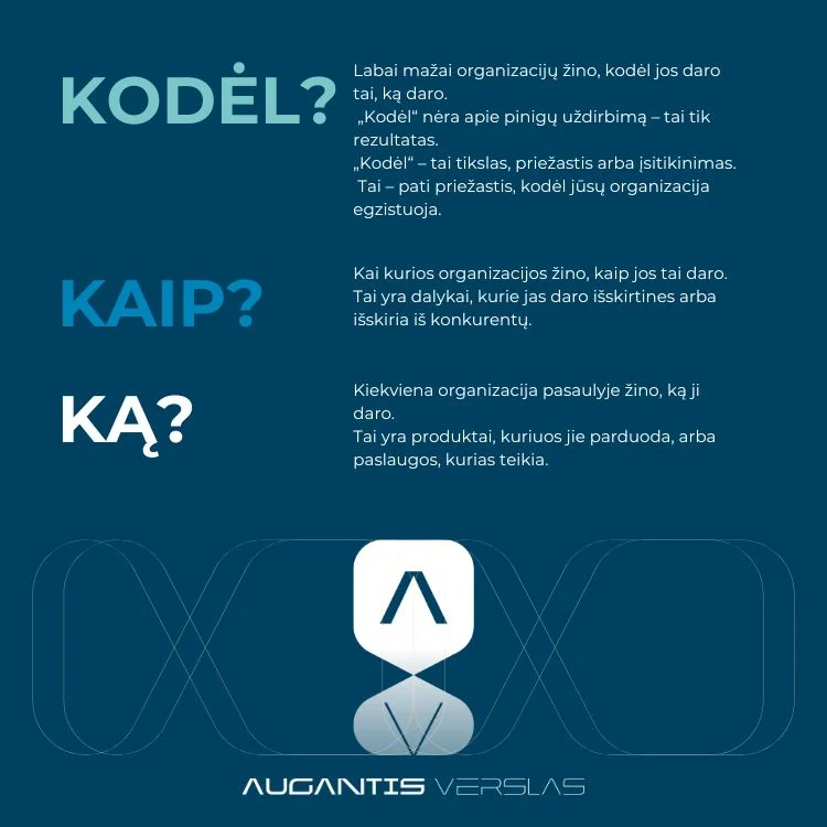 Kai žinote savo „WHY“, viskas tampa aiškiau – ką rinktis, į ką investuoti, su kuo dirbti. Pvz., „Mes egzistuojame tam, kad padėtume verslams augti greičiau ir tvariau, nes tikime, kad stiprus verslas kuria stipresnę visuomenę.“
