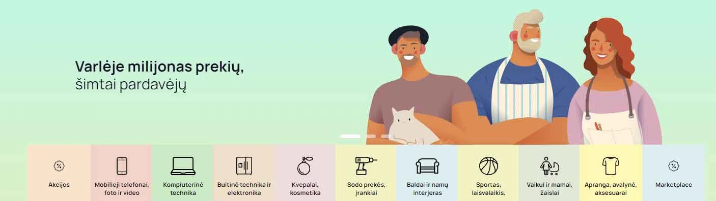 Prekių kategorijos. Jeigu turi daugiau prekių kategorijų, palengvinkite lankytojams paieškos procesą bei atvaizduokite visas kategorijas kiek įmanoma aiškiau. Tą patį padarykite ir su turimais prekiniais ženklais.