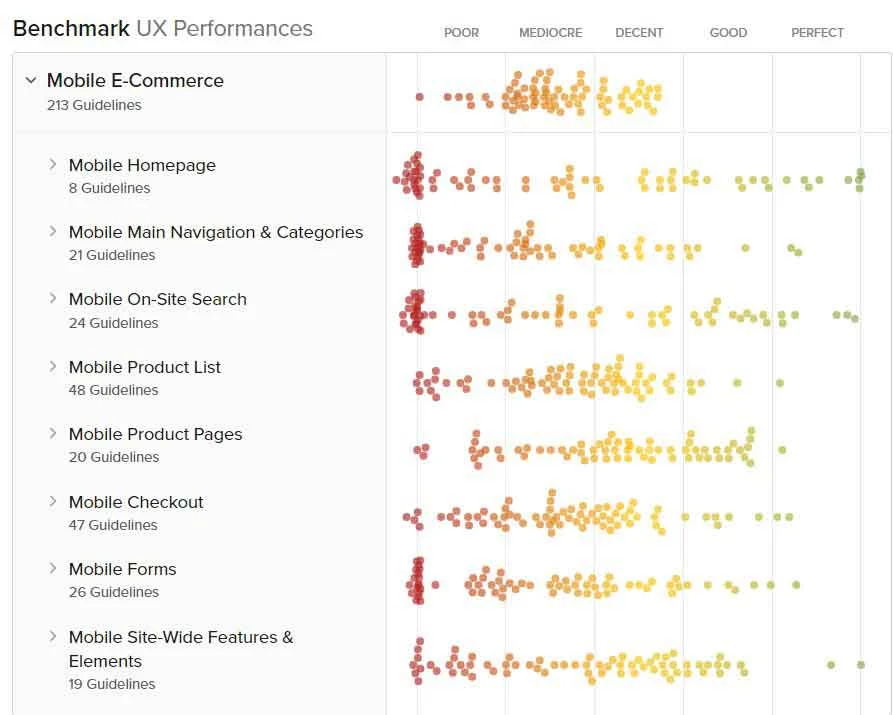Baymard.com atliko išsamius tyrimus. Nuotraukoje matosi bendras internetinių parduotuvių problemų įvertinimas iš pirkėjų pusės naršant telefonu. Šis tyrimas aiškiai rodo kur daugiausia problemų internetinėse parduotuvėse.