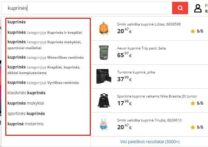 Taip pat labai svarbu, kad būtų rodomos paieškoje ir skirtingos prekių kategorijos (pvz: kuprinės mokyklai, kuprinės turistams), kad nebūtų viskas suplakta į vieną kategoriją ir reikėtų papildomai dėtis filtrus. Arba būtų rodomi drabužiai ar prekės su lyčių kategorija iškart paieškos laukelyje : batai vyrams, batai moterims. Tai pagreitina naršančiojo paieškos greitį, o tai natūraliai geresnė patirtis ir įvaizdis apie jūsų parduotuvę.