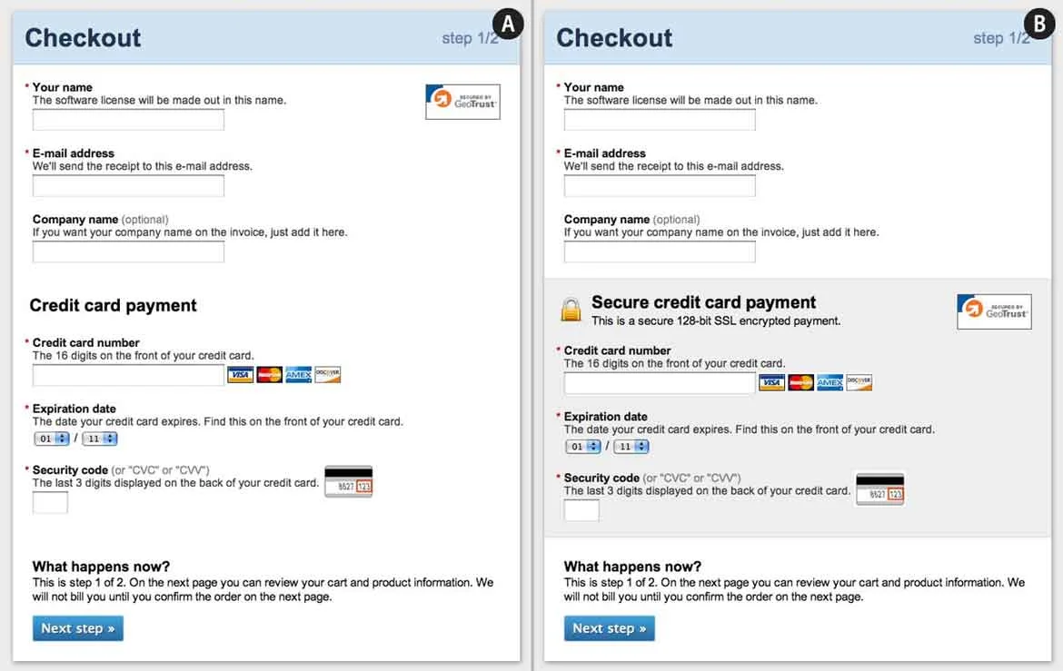 Šis vienas pavyzdys pateikia skirtumą tarp 2 formų, B nuotraukoje yra papildomi elementai, kurie suteikia saugomo jausmą. Fonas, spynos ikonėlė, saugumo partnerio logotipas, saugumo sistemos pavadinimas (SSL sertifikatas). Visa tai pašalina abejones jūsų pirkėjams, kad pinigai gali būti prarasti. Žinant įvairių istorijų, kurias girdi pirkėjai, bet kokia saugumo informacija yra naudinga.