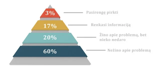 - 20 % suvokia apie problemą, tačiau nesiima veiksmų. Dar problema nėra tokia svarbi, trūksta informacijos.