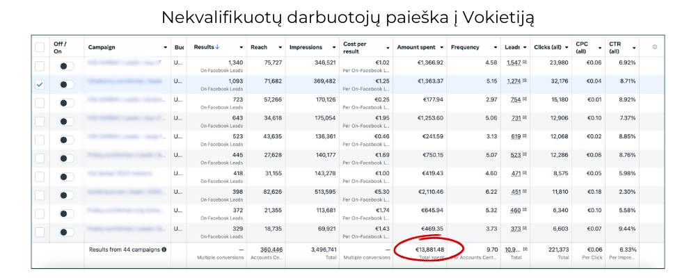Paleidome LEAD GENERATION tpo kampanijas skirtingoms auditorijoms. Kitiems darbo pasiūlymams paleidome remarketinog kampanijas srautui, kuris susidomėjo pirmosiomis reklamomis.