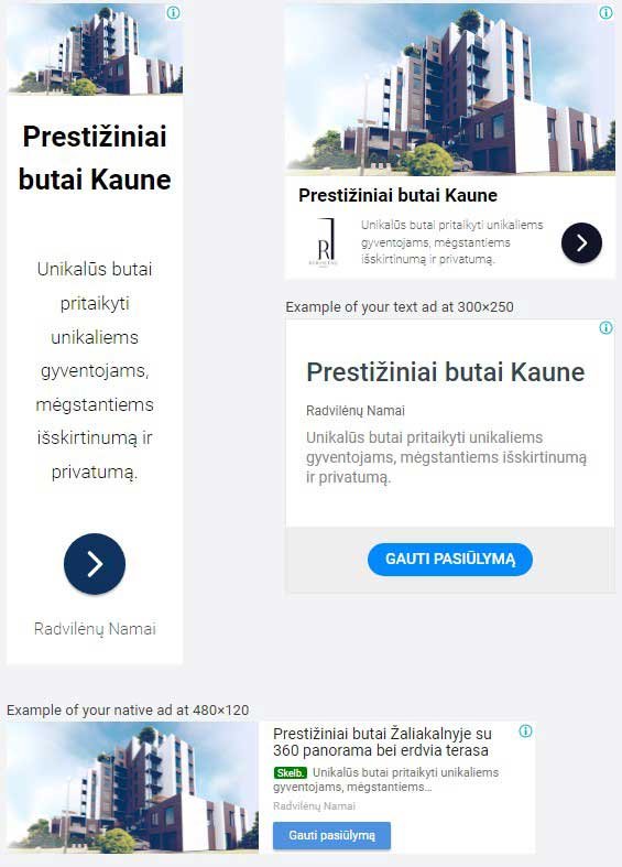 - Google banerinė reklama. Taip pat naujam srautui atvesti sukūrėme Google banerines reklamas, kurios buvo nukreiptos į auditoriją, kuri susijusi su naujo buto paieška Kaune.