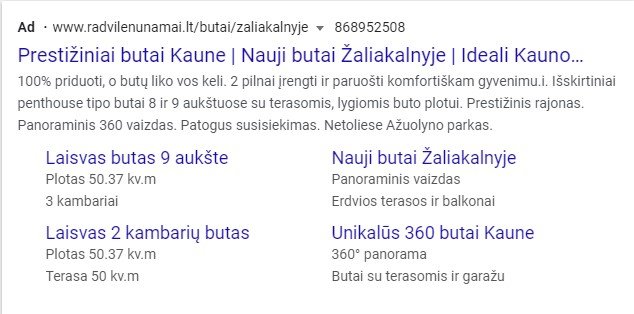 - Google reklama. Paleidome Google Ads paieškos reklaamos kampaniją žmonėms, ieškantiems naujų butų Kaune. Reklama buvo rodoma tik tiems, kurie suvesdavo konkrečius raktažodžius kaip „nauji butai kaune“, „butai žaliakalnyje“ ir panašūs.